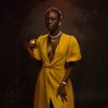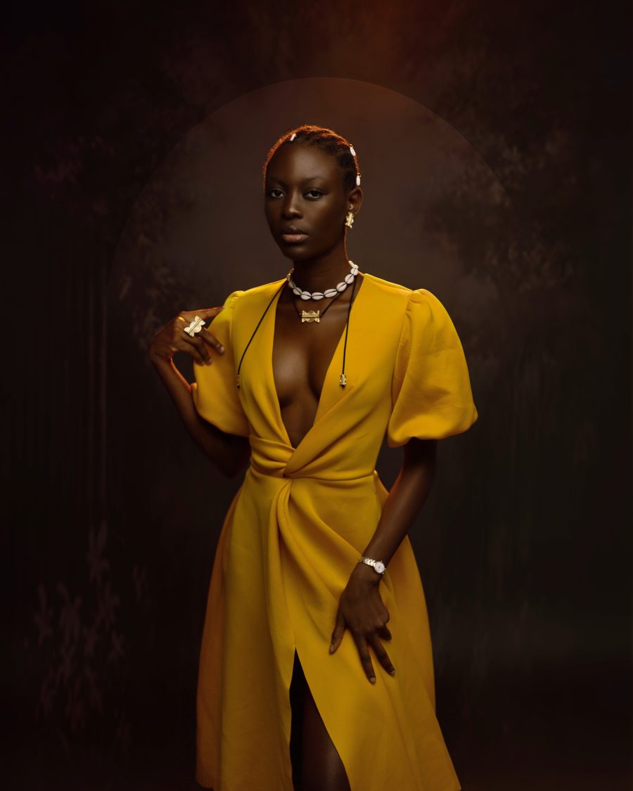 Robe longue, décolleté, volante avec fente avant de couleur jaune moutard.